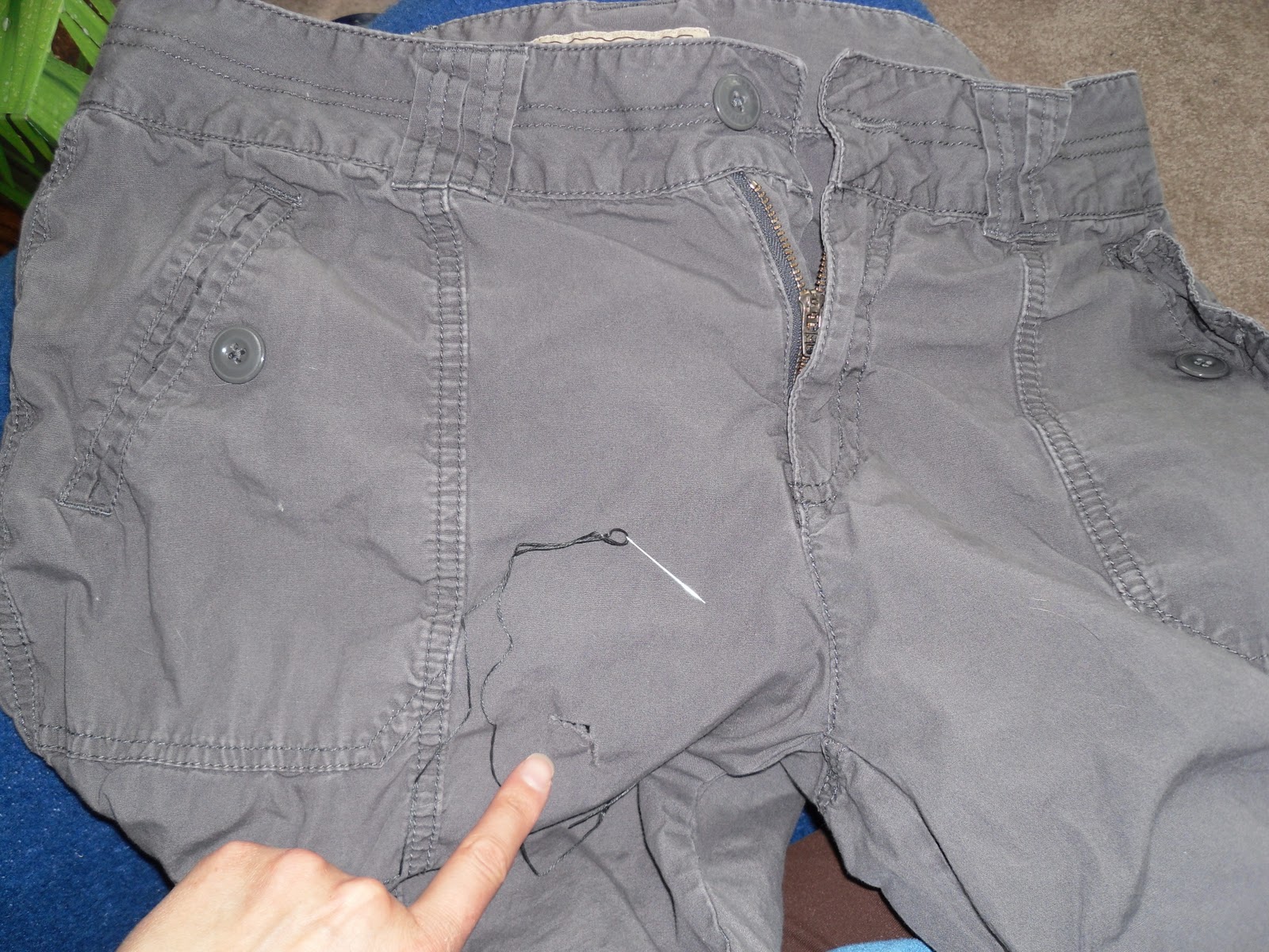 Holes in pants, not very appealing. They still fit, they're comfortable but not ready to be tossed. Only one thing to do, fix them to look better. These pants started off with an odd L shaped tear in a not exactly flattering spot.